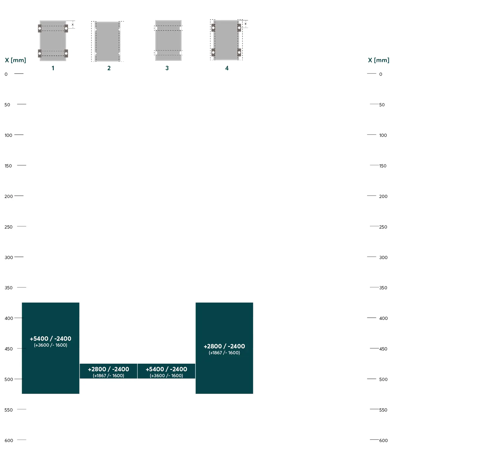 Questa pagina descrive per il Panel vision XXL il tipo di fissaggio con viti, morsetti o sistema di inserimento per ogni variante di montaggio, le aree sul telaio del modulo approvate per il fissaggio e il carico di pressione e aspirazione massimo consentito sul modulo. La definizione dell'area di fissaggio (x) risulta dalla distanza tra il bordo esterno del modulo e il centro del morsetto utilizzato.